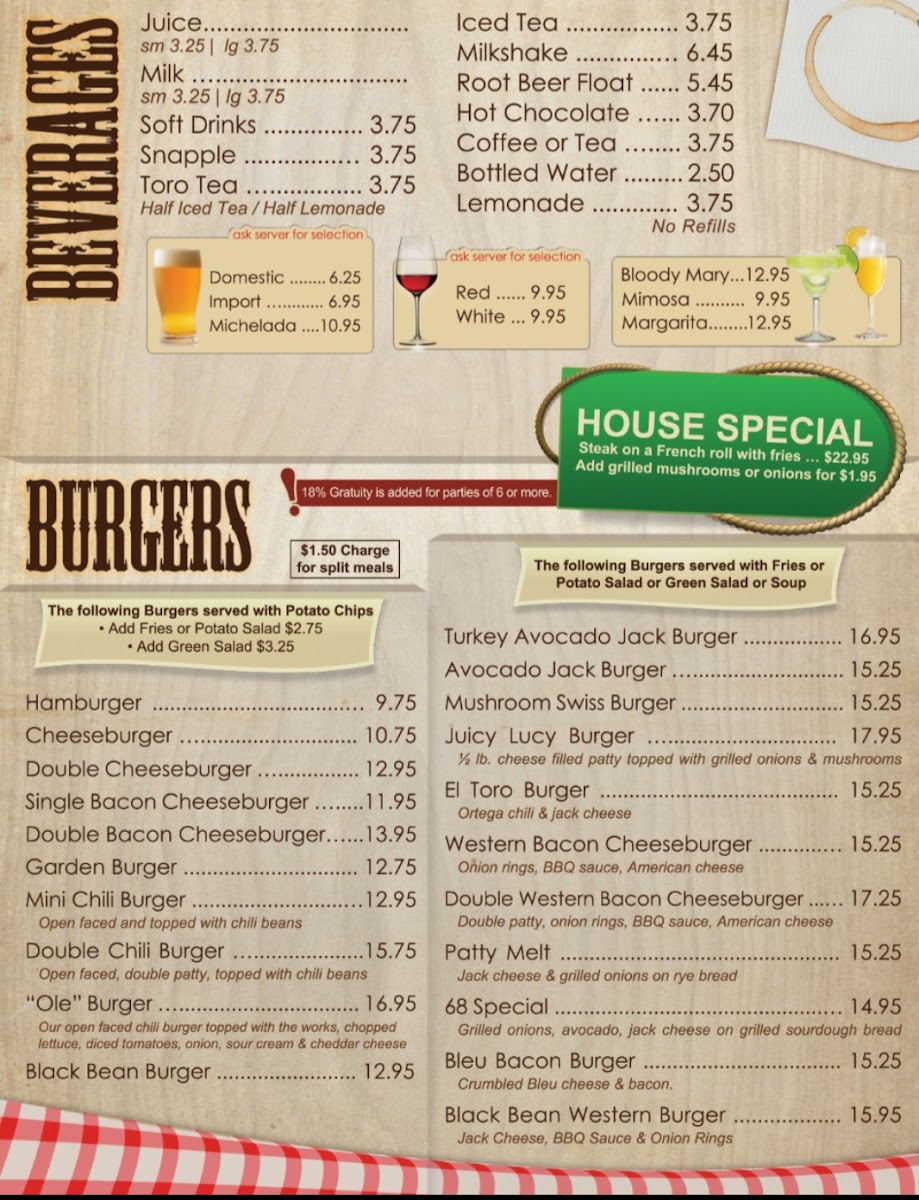 The Beverages selection includes a variety of options such as juices, milk, iced tea, soft drinks, lemonade, and specialty items like milkshakes, root beer floats, hot chocolate, and the signature Toro Tea. Alcoholic beverage options include mimosas and micheladas.