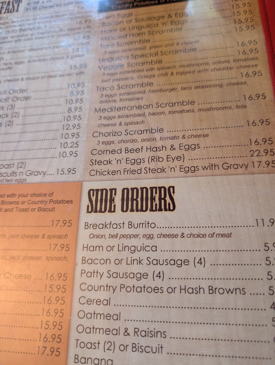 The menu at Toro Place Cafe features a diverse selection of offerings primarily focused on breakfast and casual dining. It is structured to accommodate a range of preferences, from hearty morning meals to lighter options and beverages.